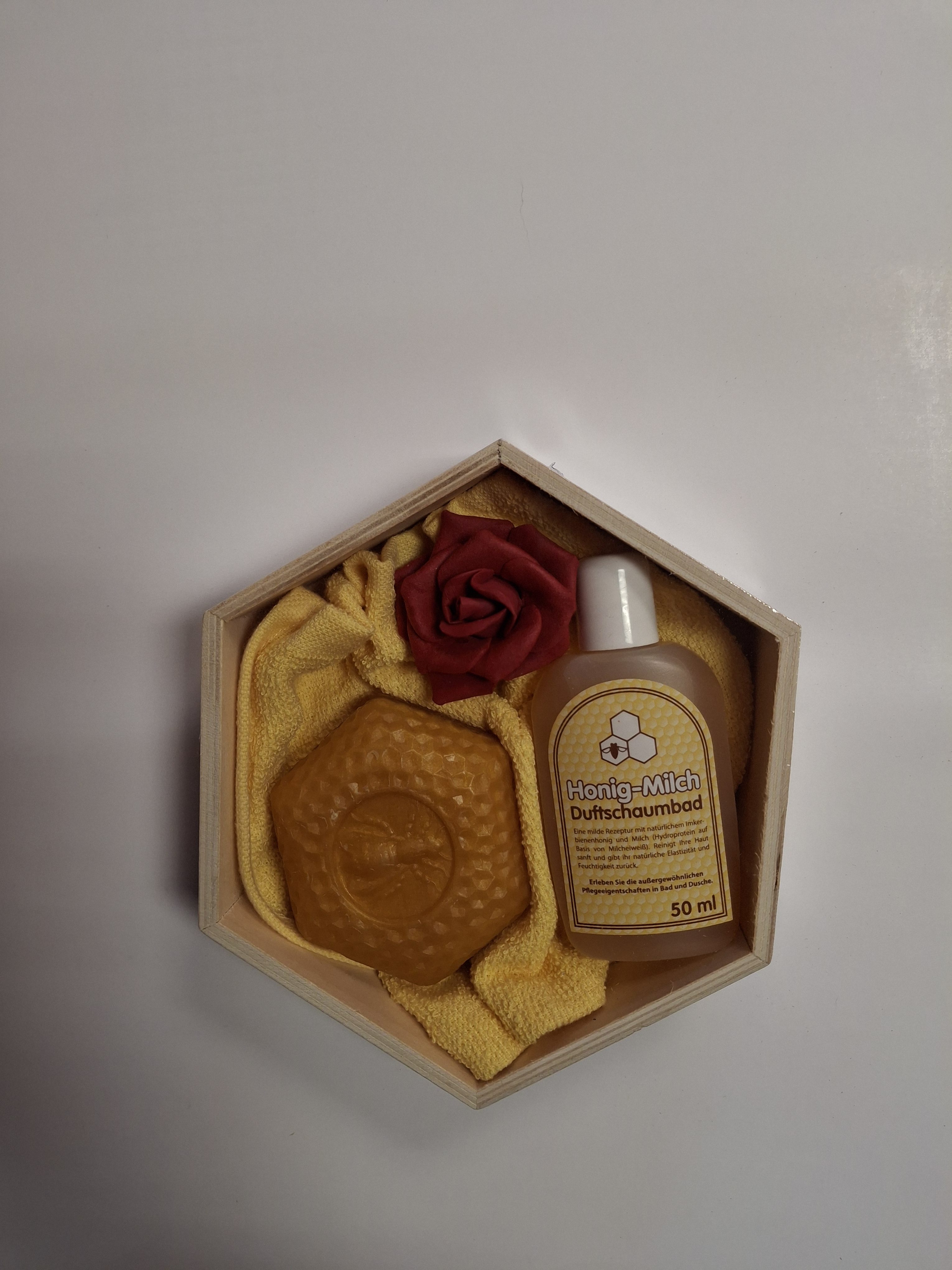 Geschenkpackung Holz-Wabe 1 Seife 100g 1 Bad 50ml 1 Waschlappen
